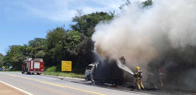 Caminhão carregado com embutidos pega fogo na MG-050, em Formiga
